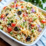 Looking for a refreshing and easy-to-make dish? This spaghetti salad with Italian dressing is packed with fresh veggies, savory black olives, and Parmesan cheese, all tossed in a zesty Italian dressing. It’s the perfect side dish for BBQs or meal prep. Light, flavorful, and irresistibly delicious—save this cold spaghetti salad recipe for your next gathering!
