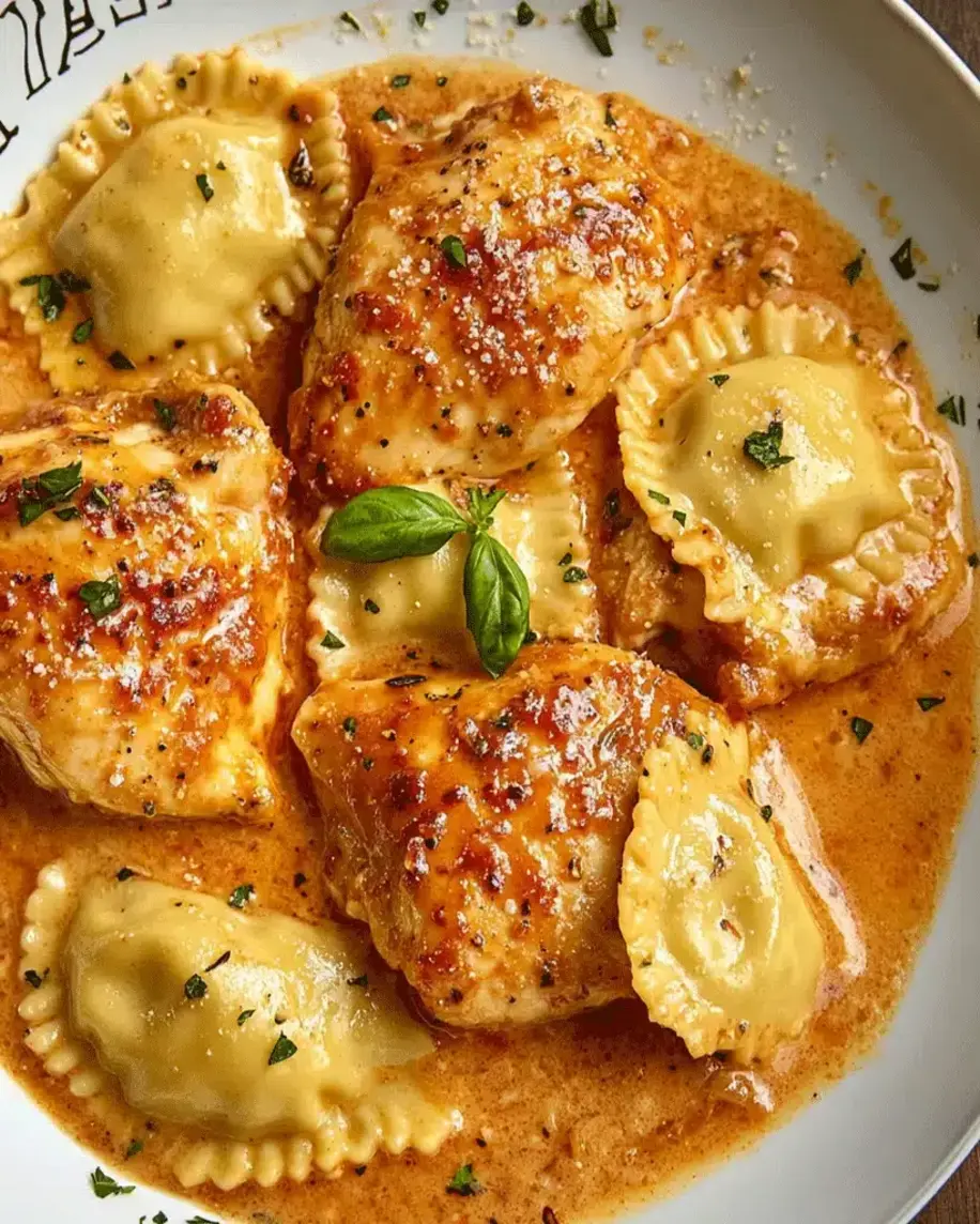 A stunning plate of Marry Me Chicken and Ravioli, featuring golden chicken pieces and cheese ravioli coated in a luscious, speckled sun-dried tomato cream sauce.