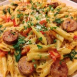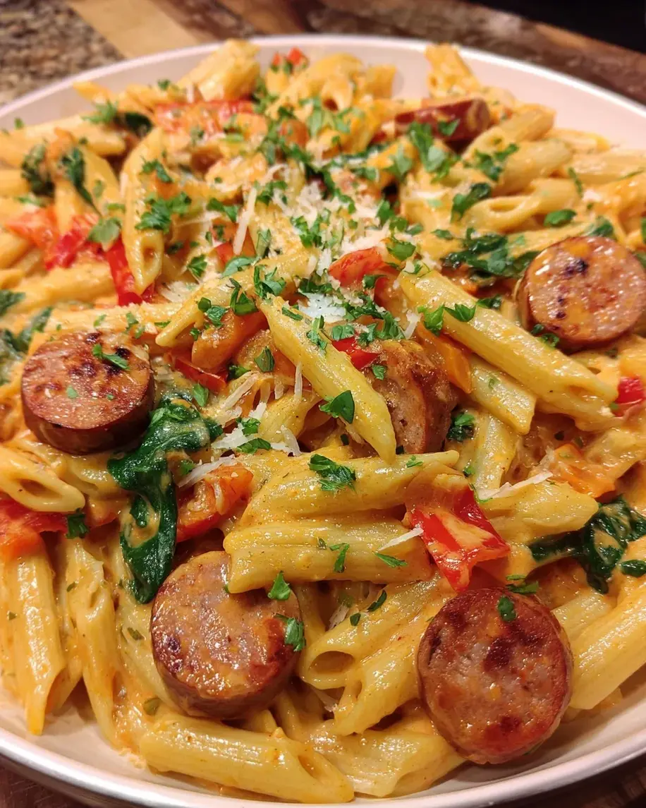 A rich and creamy Cajun sausage pasta dish featuring smoked sausage, vegetables, and a flavorful sauce.
