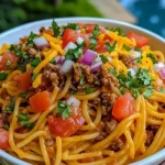 Taco Spaghetti combines the bold flavors of tacos with the comforting heartiness of pasta in one quick and easy dish. Seasoned ground beef, perfectly cooked spaghetti, and a cheesy, zesty sauce come together with fresh taco toppings for a dinner everyone will love.