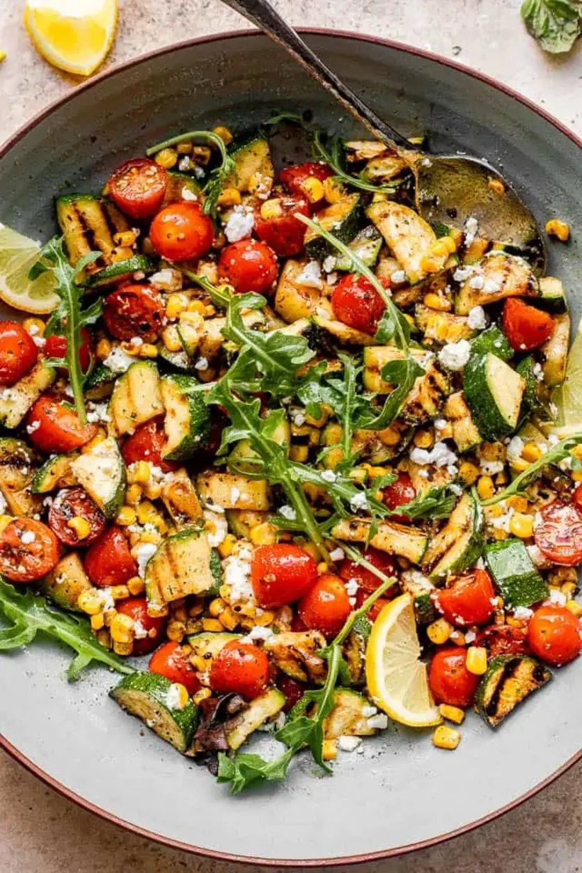 Perfected Texture — As a classically trained chef, I know that texture can make or break a salad. The zucchini is cut into ½-inch thick half-moons, which gives them enough surface area to char beautifully while remaining sturdy enough to not fall apart on the grill. The corn gets a quick char that keeps it crisp-tender, and the cherry tomatoes soften just right, releasing their juices without turning into mush. The arugula adds a peppery crunch that holds up perfectly against the warm vegetables.