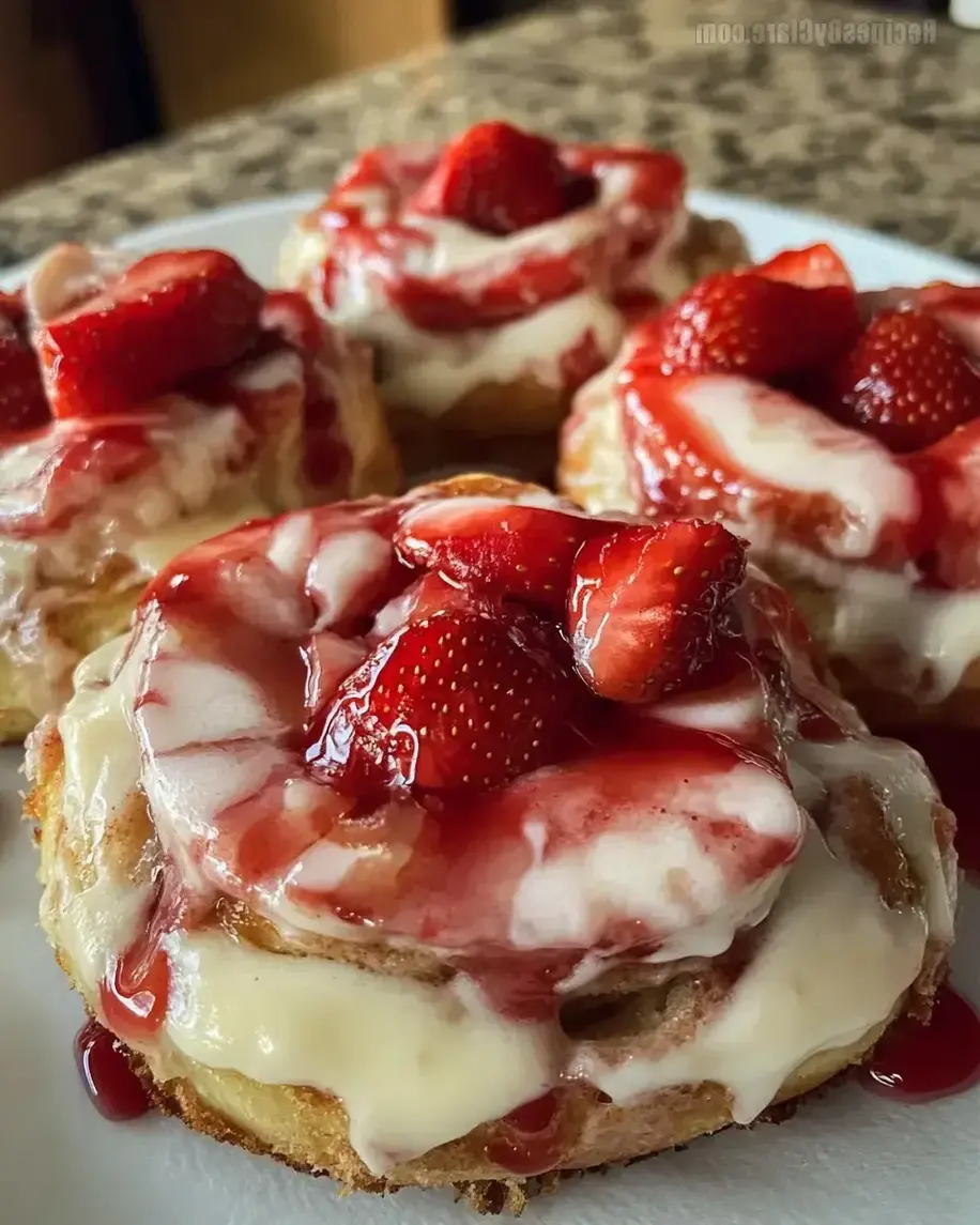Fresh, warm Strawberry Cheesecake Cinnamon Rolls with a luscious cream cheese glaze.