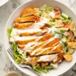 - Salad: In a large mixing bowl toss the lettuce with your preferred amount of dressing (start off with less than you think then work up). Toss in the bacon and croutons, then serve up individual portions with the sliced chicken on top. Drizzle over more dressing if desired.