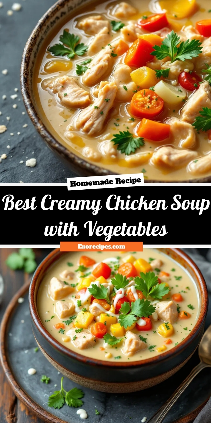 Classic vegetables for Creamy Chicken Soup with Vegetables include carrots, celery, and onions as a base. You can also add potatoes for heartiness, broccoli or peas for color and nutrients, and spinach or kale for a healthy green boost. These vegetables hold up well in the creamy broth and complement the chicken flavor perfectly.