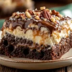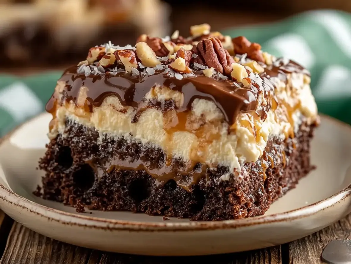 - 1️⃣Prepare the Cake:Preheat your oven to 350°F (175°C). Grease and flour a 9×13-inch baking pan.Mix the German chocolate cake batter according to the package instructions. Pour the batter into the prepared pan and bake for 25-30 minutes or until a toothpick inserted into the center comes out clean. Allow the cake to cool in the pan for about 10 minutes.2️⃣Poke the Cake:Using the handle of a wooden spoon or a skewer, poke holes all over the cake, spacing them about 1 inch apart.3️⃣Prepare the Filling:In a mixing bowl, combine the sweetened condensed milk and caramel sauce. Stir until smooth. Pour this mixture over the cake, ensuring it seeps into the holes. Use a spatula to spread it evenly, if necessary.4️⃣Chill the Cake:Cover the cake with plastic wrap and refrigerate for at least 2 hours to allow the filling to set.5️⃣Prepare the Topping:In a dry skillet, toast the shredded coconut and chopped pecans over medium heat, stirring frequently until lightly browned and fragrant. Transfer to a plate to cool completely.6️⃣Assemble the Topping:Spread the Cool Whip or whipped topping evenly over the chilled cake. Sprinkle the toasted coconut and pecans over the top. If desired, drizzle melted chocolate chips over the cake for an extra layer of flavor.7️⃣Garnish and Serve:Slice the cake into squares and serve chilled. Store leftovers covered in the refrigerator for up to 3 days.