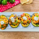 - Remove from the oven and add a dollop of sour cream to the top of each boat.