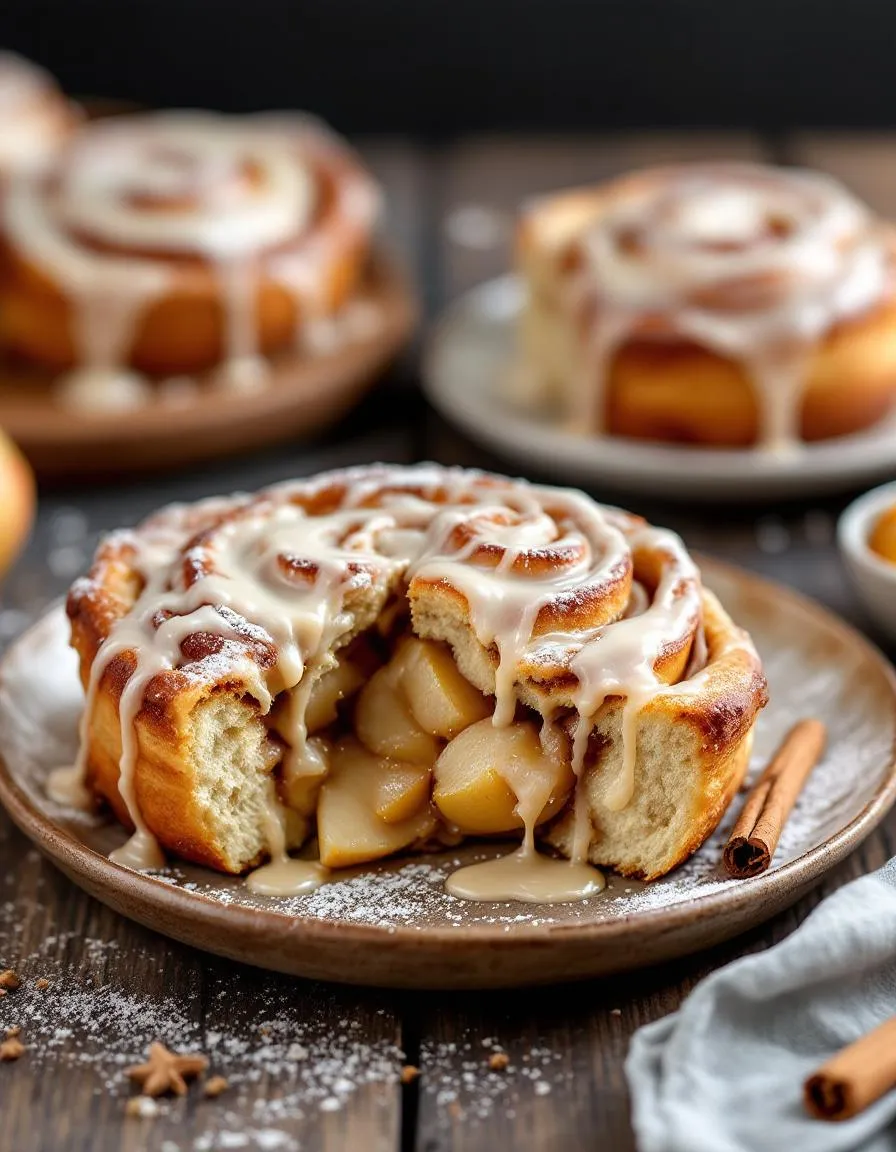 Soft, fluffy cinnamon rolls filled with sweet apple pieces and warm spices, topped with a creamy glaze.