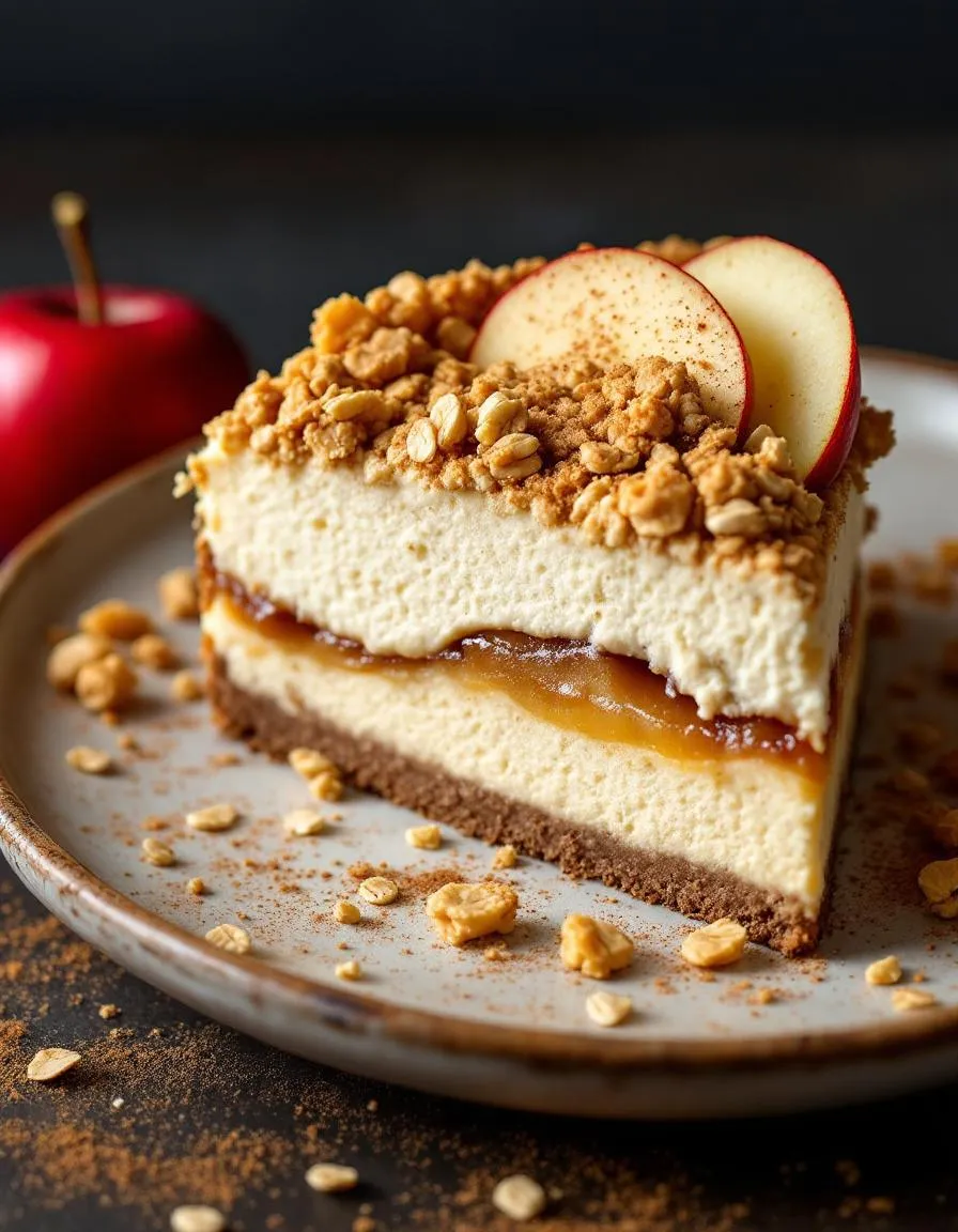 A decadent dessert combining creamy cheesecake with spiced apple filling and a buttery crumble topping.