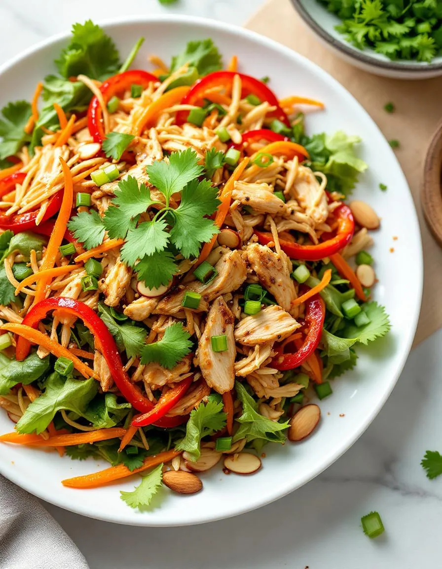 A vibrant and crunchy salad with tender chicken, crisp vegetables, and a tangy Asian-inspired dressing.