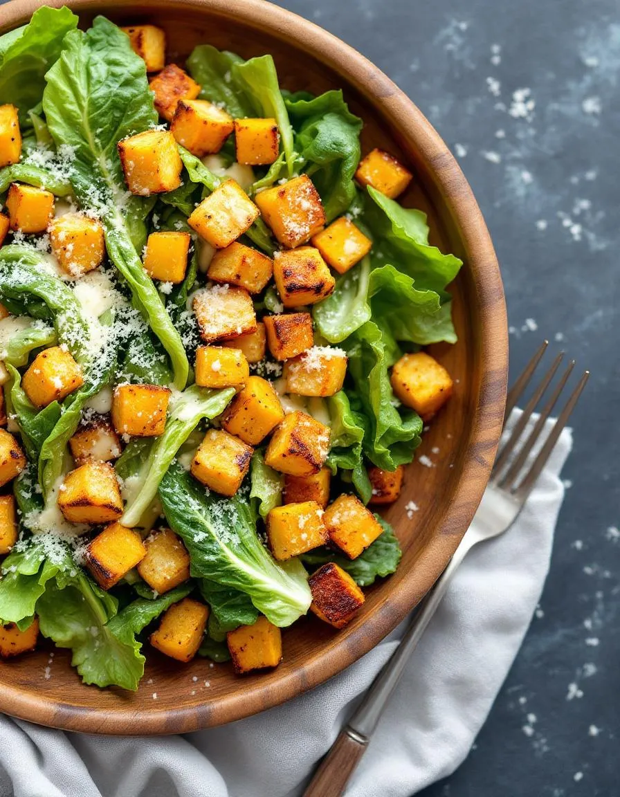A seasonal twist on the classic Caesar salad, featuring roasted delicata squash croutons and a creamy dressing.