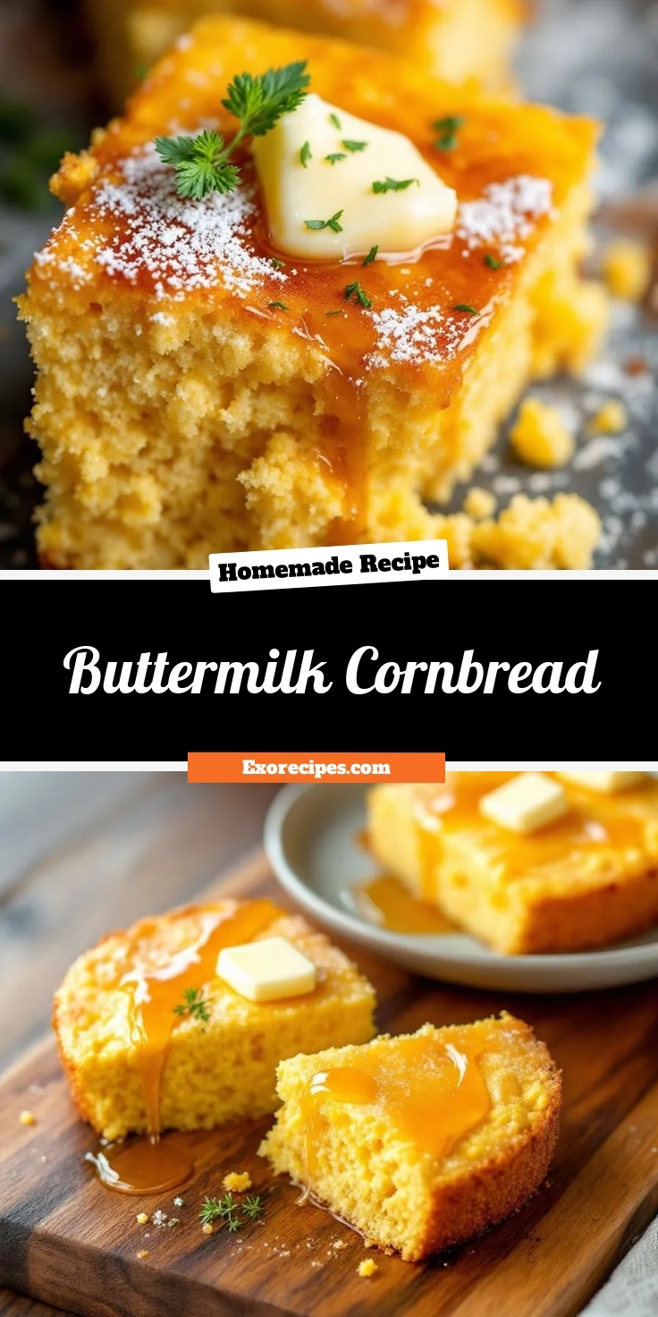 Buttermilk Cornbread shines when served warm straight from the oven, with a pat of butter melting into its golden crust. For a rustic touch, slice it into wedges and arrange them on a wooden board alongside honey or jam. Alternatively, bake it in a cast-iron skillet for a charming presentation that doubles as a serving dish. During holidays or family gatherings, pair it with a drizzle of maple syrup or a sprinkle of flaky sea salt to elevate its flavor. Whether you serve it at brunch, a backyard barbecue, or a cozy weeknight dinner, Buttermilk Cornbread always adds a comforting touch.
