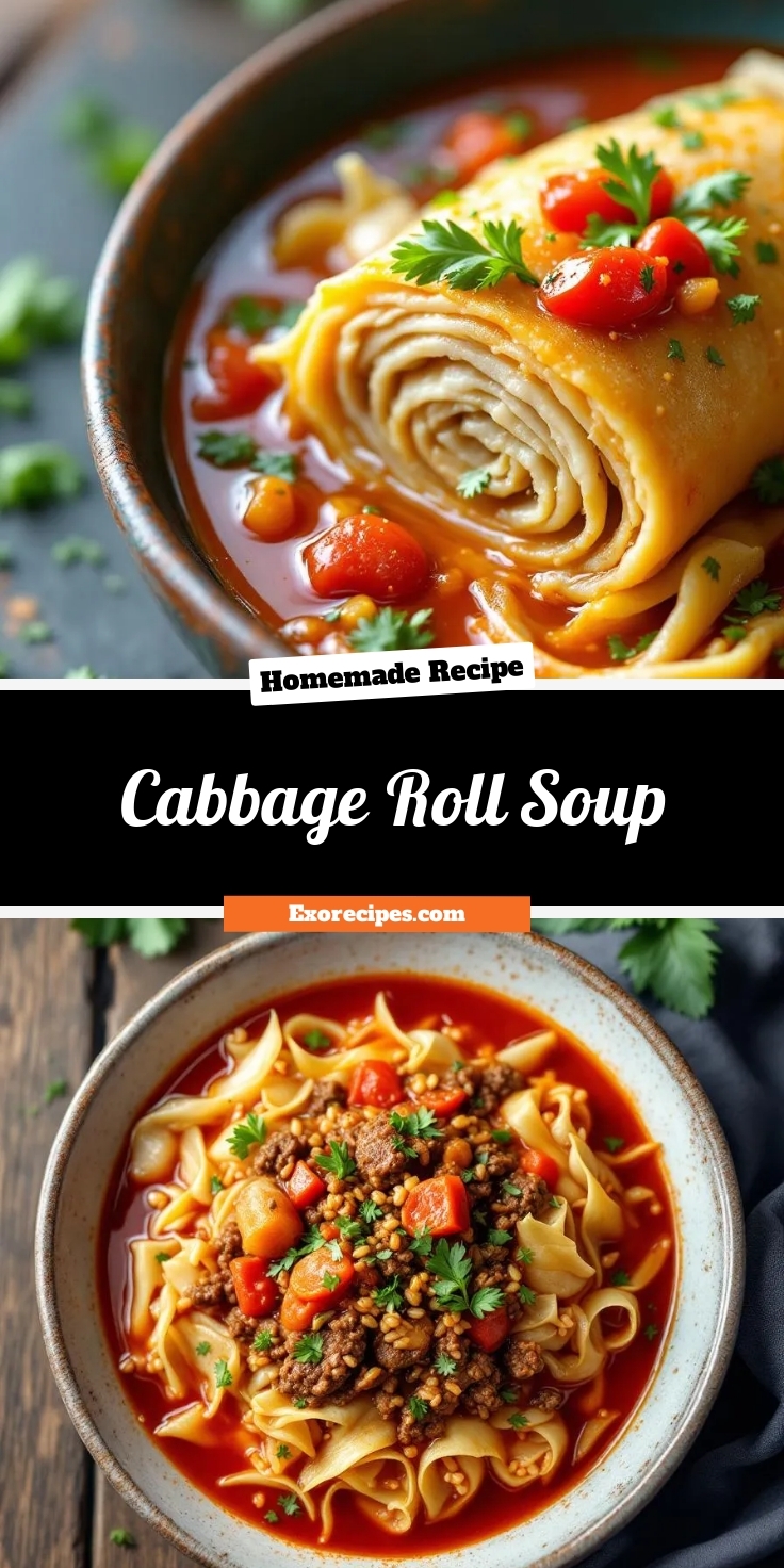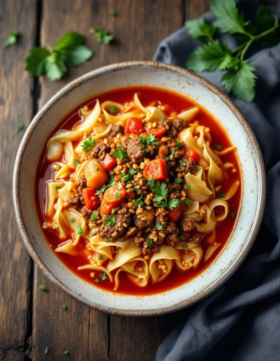 A hearty and comforting soup inspired by traditional cabbage rolls, packed with ground beef, rice, and tender cabbage in a rich tomato broth.
