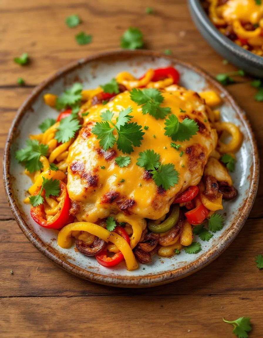 A flavorful and cheesy baked chicken dish with fajita-inspired seasonings, perfect for a quick and delicious dinner.