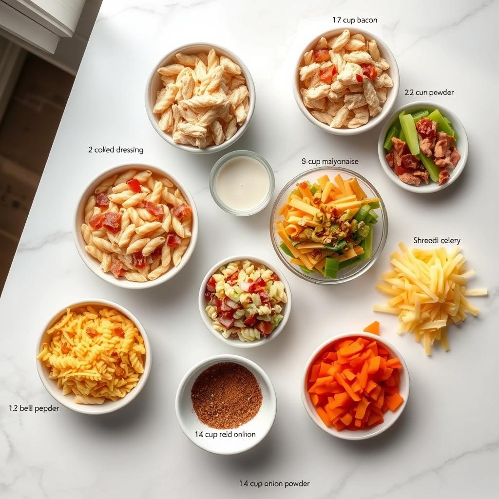- In a large bowl, combine the cooled pasta, diced chicken, crumbled bacon, cheddar cheese, red onion, celery, and bell pepper.