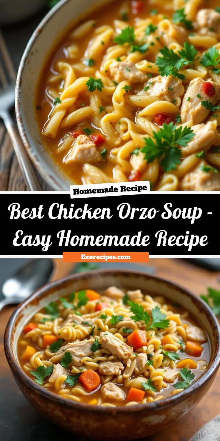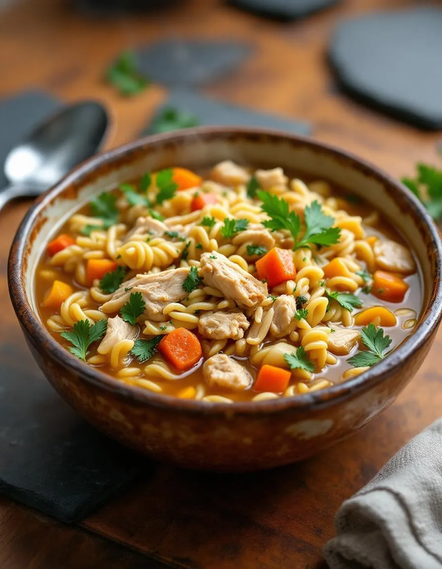 A comforting and hearty soup with tender chicken, orzo pasta, and vegetables in a flavorful broth.