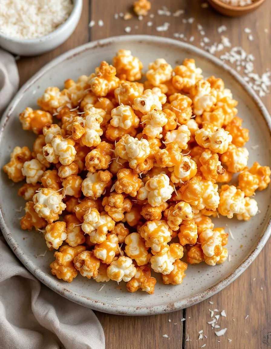 A sweet and crunchy treat combining caramel-coated popcorn with toasted coconut for an irresistible snack.