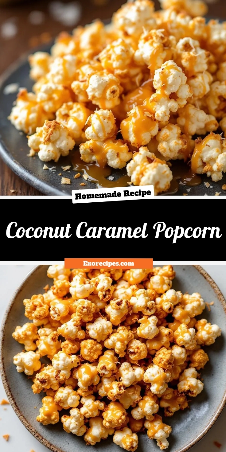 A sweet and crunchy treat combining caramel-coated popcorn with toasted coconut for a tropical twist.