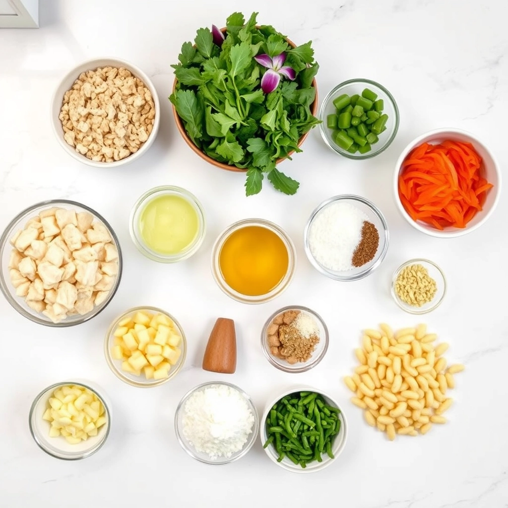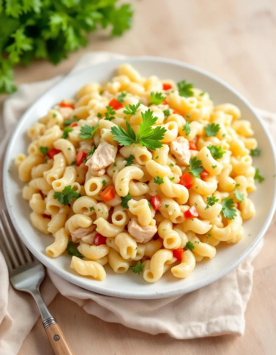 A refreshing and creamy pasta salad with tender chicken, crisp vegetables, and a tangy dressing.