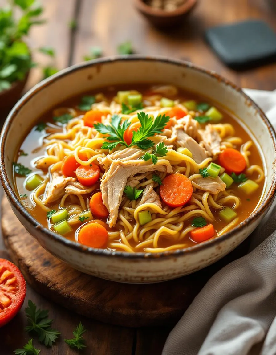 Start by heating a large pot over medium heat and drizzle in a bit of olive oil. Toss in diced onions, carrots, and celery, then stir them until they soften, about 5 minutes. Next, add minced garlic and sauté for another minute until fragrant. Pour in low-sodium chicken broth, then drop in boneless, skinless chicken thighs for richer flavor. Bring the mixture to a gentle boil, then reduce the heat and let it simmer for 20 minutes. Meanwhile, shred pre-cooked rotisserie chicken if you’re short on time—this cuts cooking down significantly. Once the thighs cook through, remove them, shred the meat, and return it to the pot. Stir in egg noodles and cook until tender, about 8 minutes. Finally, season with salt, pepper, and fresh parsley. For a creamier texture, whisk in a splash of heavy cream at the end. Serve hot with crusty bread, and enjoy your Cozy Chicken Soup Recipe without the fuss.