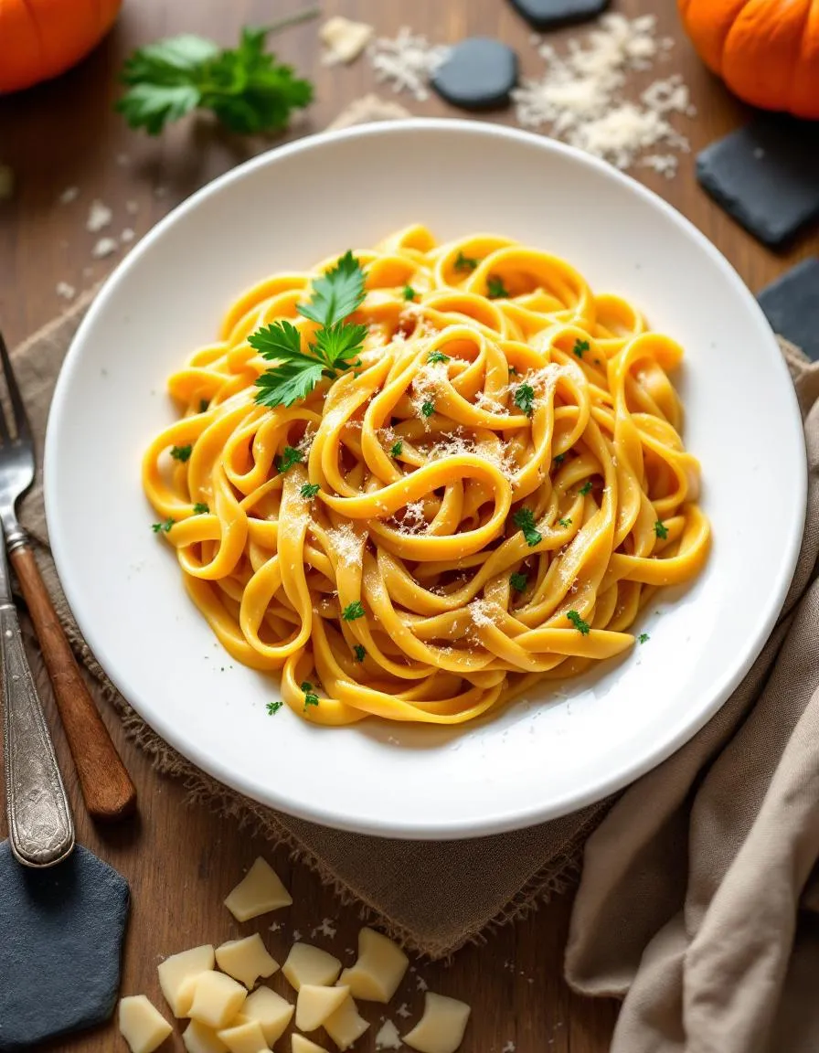 Start by boiling your pasta in salted water until al dente, then drain and set it aside. Meanwhile, heat a large skillet over medium heat and melt butter before adding minced garlic for a quick sauté. Stir in pumpkin puree, heavy cream, and grated Parmesan cheese, whisking until the sauce turns smooth and velvety. For extra flavor, sprinkle in nutmeg and black pepper, then fold the cooked pasta into the sauce until every strand is coated. If the sauce feels too thick, thin it with a splash of reserved pasta water. While the Creamy Pumpkin Alfredo Pasta Delight simmers, toast some breadcrumbs in a separate pan for a crunchy topping. Finally, garnish with fresh parsley and serve immediately. To save time, use canned pumpkin puree and pre-grated Parmesan, but avoid oversaucing the pasta—start with less and add more as needed.