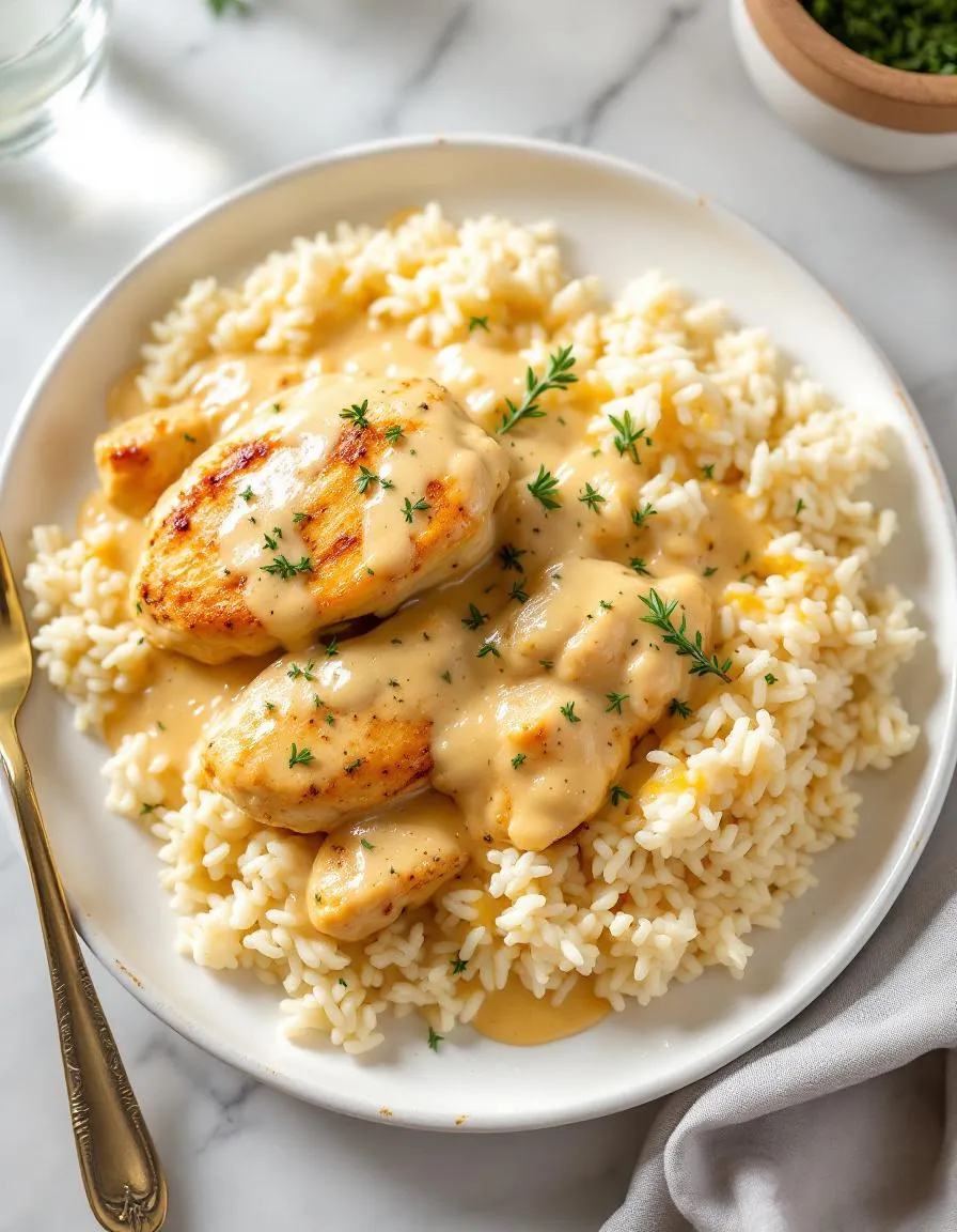 A comforting dish featuring tender chicken smothered in a creamy sauce served over fluffy rice.
