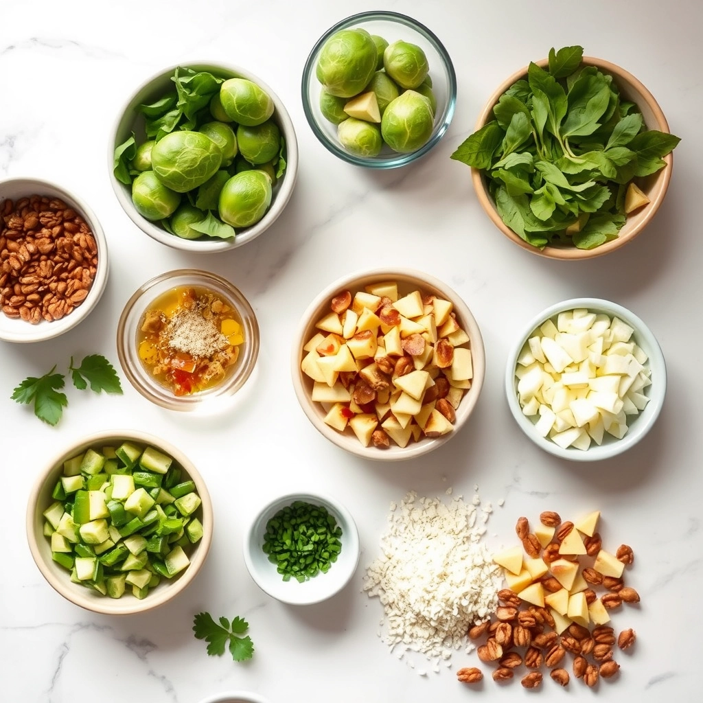 A fresh and crunchy salad featuring shredded Brussels sprouts, crisp apples, and toasted walnuts for a delightful mix of textures and flavors.
