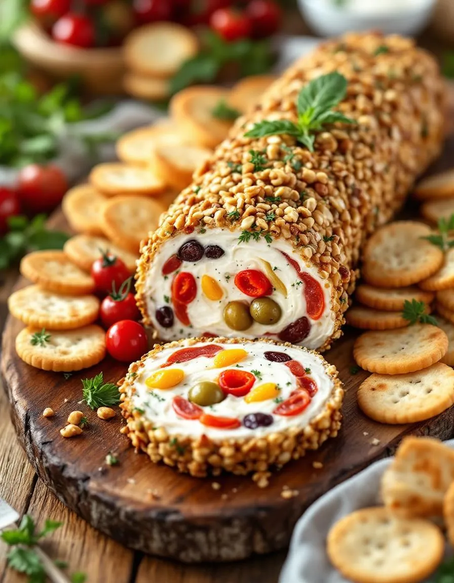 A creamy, savory cheese log packed with antipasto flavors, perfect for holiday gatherings.