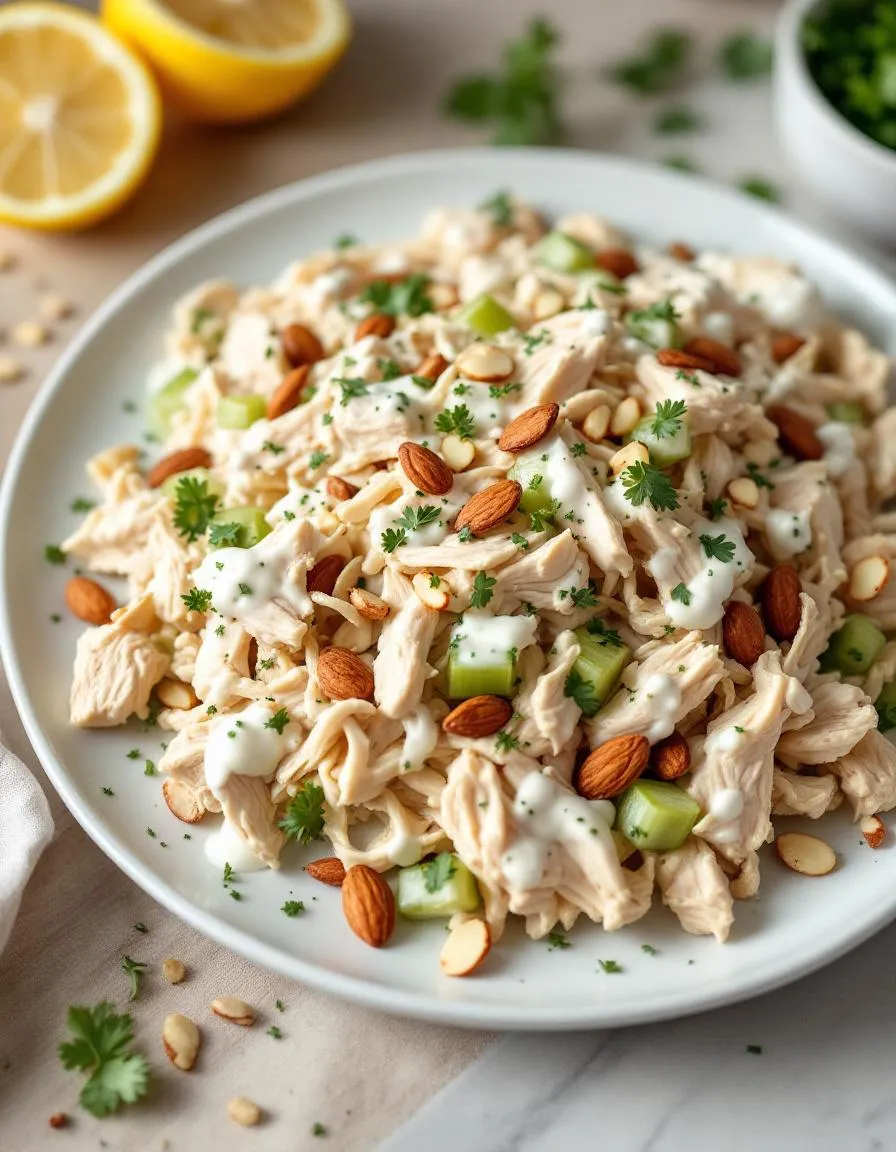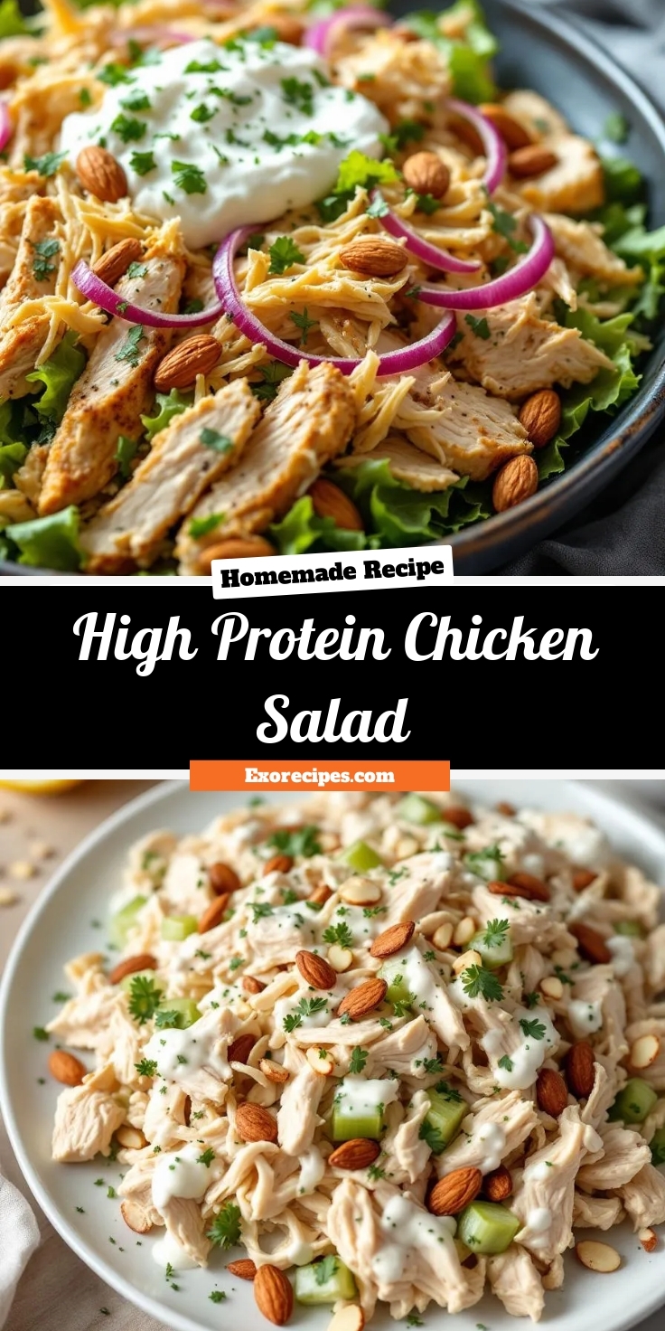 Start by prepping your ingredients for the High Protein Chicken Salad to save time later. Chop the cooked chicken into bite-sized pieces, then dice the celery and red onion finely for a balanced texture. In a large bowl, whisk together Greek yogurt, Dijon mustard, and lemon juice until smooth. Next, fold in the chicken, celery, and onion until everything coats evenly. For extra flavor, sprinkle in fresh dill or parsley and a pinch of salt and pepper. Meanwhile, toast the almonds lightly in a dry pan for a crunchy topping. Once cooled, toss them into the salad or save them for garnish. If you’re meal prepping, store the High Protein Chicken Salad in an airtight container and chill it for at least 30 minutes to let the flavors meld. Serve it over a bed of greens, in a whole-grain wrap, or with crackers for a quick lunch. To speed things up, use leftover rotisserie chicken or pre-cooked chicken breast from your weekly batch cooking.