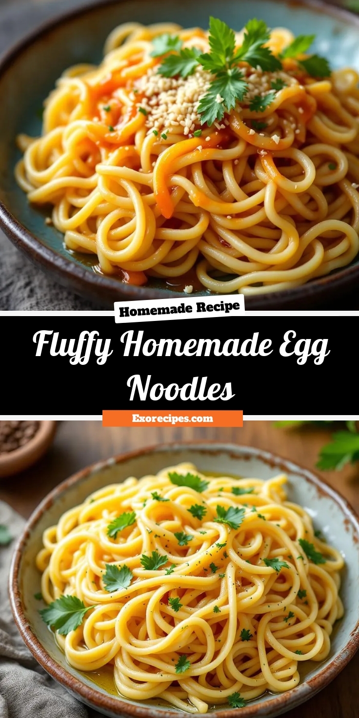r a damp towel for 30 minutes to relax the gluten. Meanwhile, dust your work surface and rolling pin with flour to prevent sticking. Roll the dough out thinly, about 1/8-inch thick, then cut into strips using a sharp knife or pizza cutter. For extra efficiency, stack a few sheets of dough before slicing to save time. Separate the noodles gently and let them dry for 10-15 minutes before cooking.Bring a large pot of salted water to a rolling boil and cook the Fluffy Homemade Egg Noodles in batches for 2-3 minutes until they float to the top. Drain immediately and toss with butter or sauce to prevent sticking. For meal prep, you can freeze uncooked noodles on a baking sheet before transferring to a bag—they’ll keep for months and cook straight from frozen.