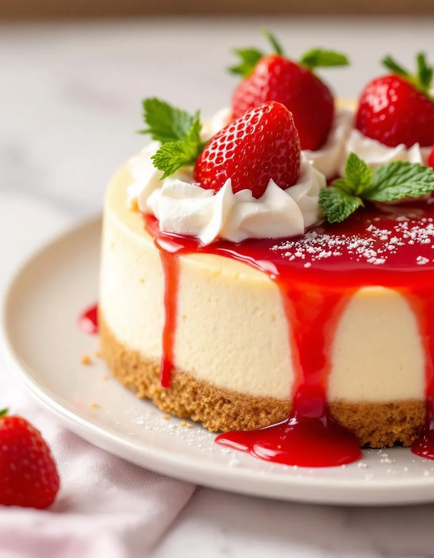 A creamy and rich strawberry cheesecake with a buttery graham cracker crust, topped with fresh strawberry sauce.