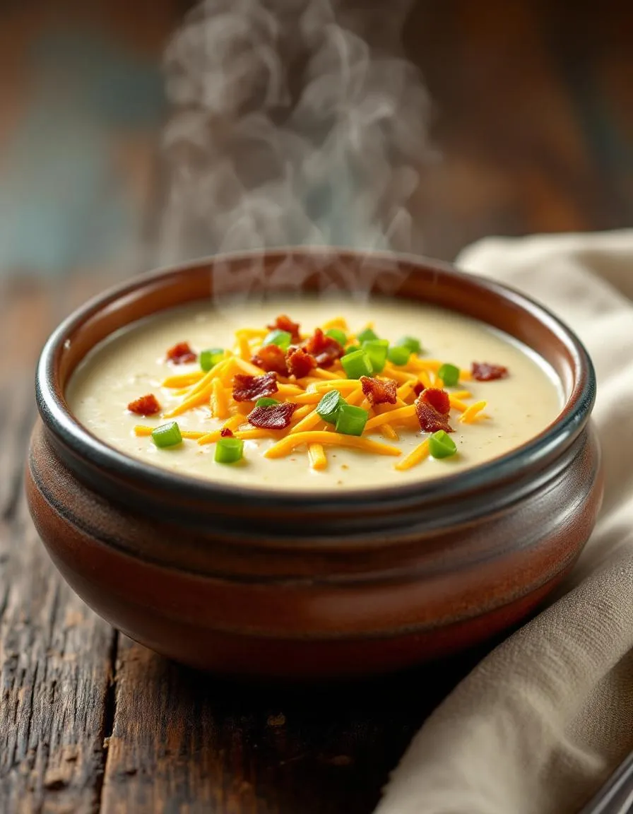 - Serve hot, garnished with crumbled bacon and sliced green onions.