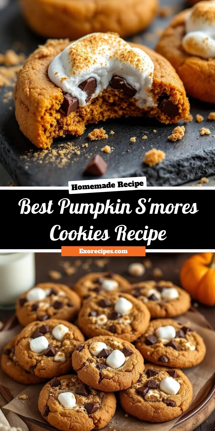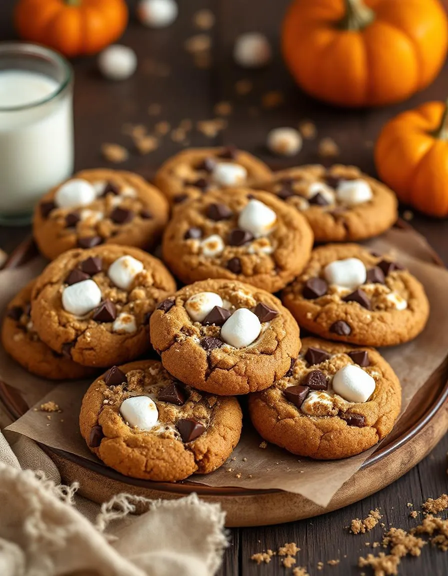 Soft pumpkin cookies with gooey marshmallow and chocolate chunks, combining the flavors of fall and classic s’mores.
