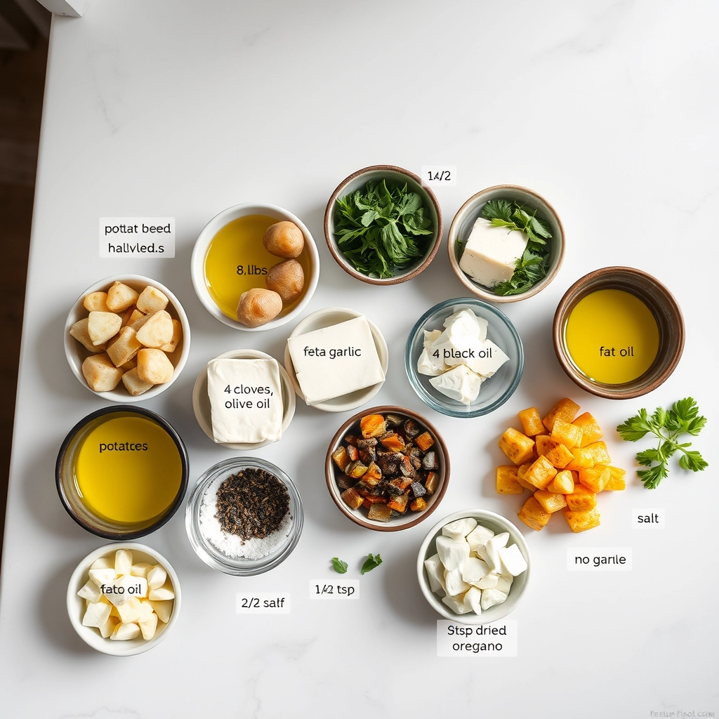 A flavorful and comforting dish featuring crispy roasted potatoes, creamy baked feta, and aromatic garlic.