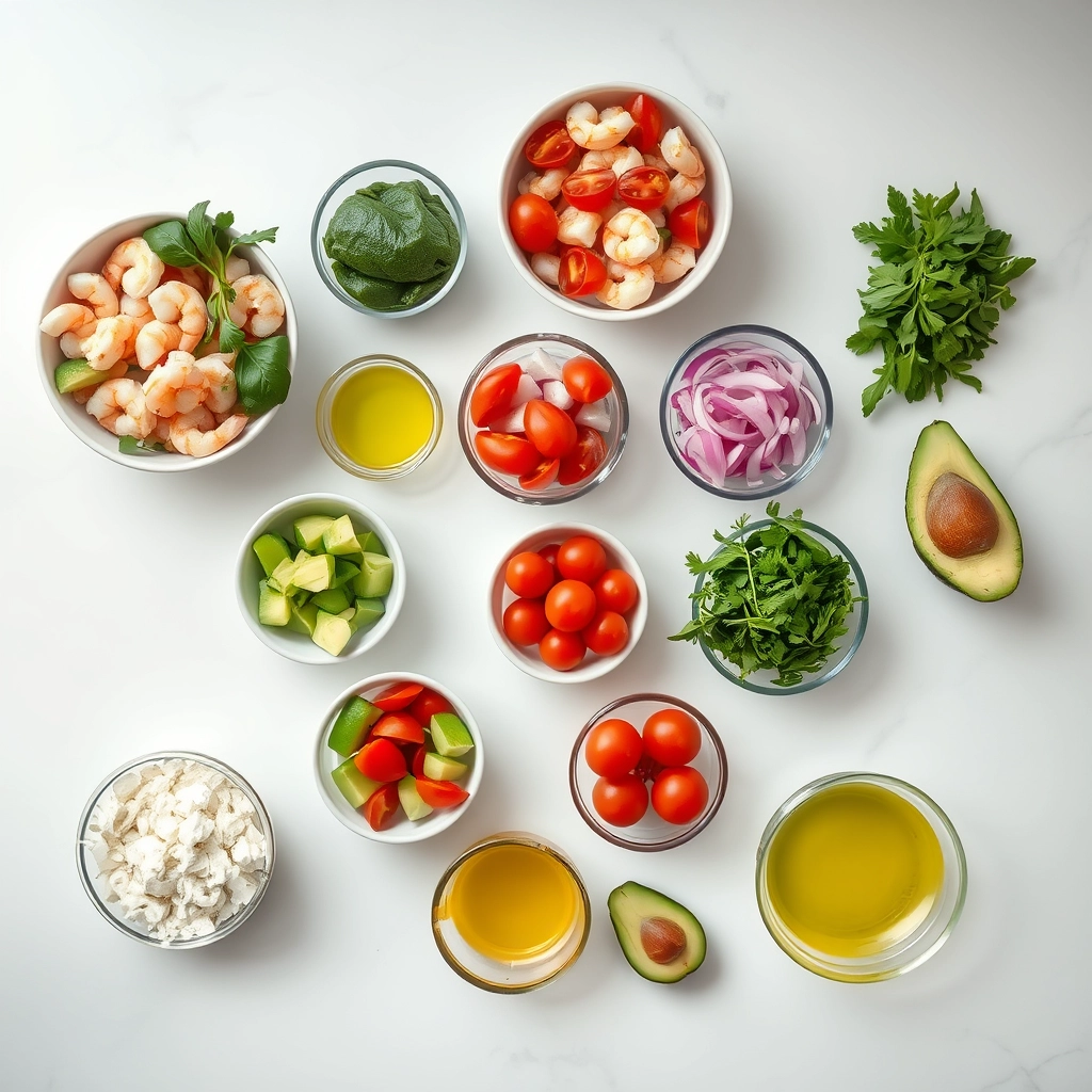 A refreshing and protein-packed salad with juicy shrimp, creamy avocado, and crisp vegetables.