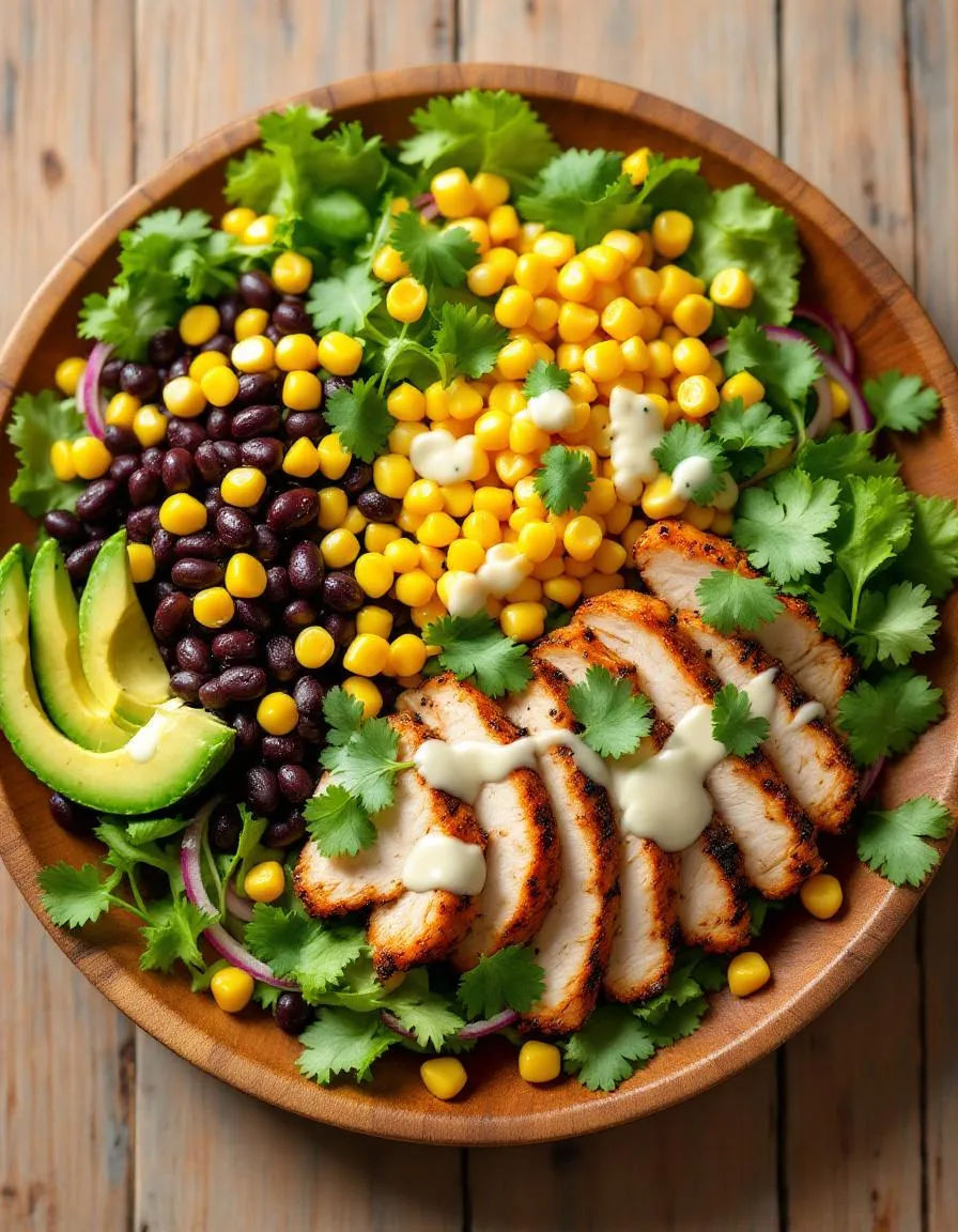 A zesty and colorful salad with grilled chicken, black beans, corn, and avocado, topped with a creamy lime dressing.