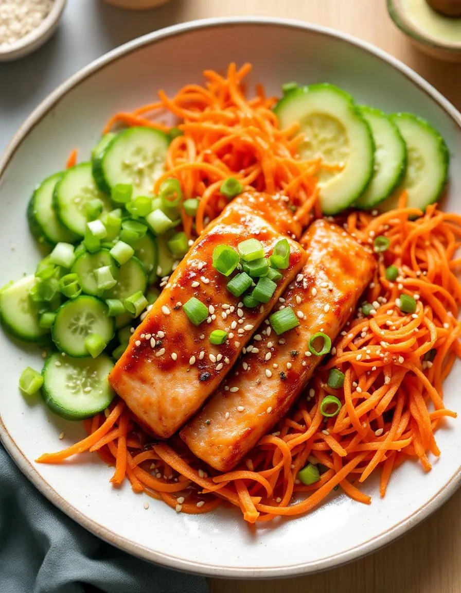 Start by preheating your oven to 400°F so it’s ready when you finish prepping the Spicy Ginger Caramelized Salmon Bowl. While it heats, whisk together the sauce—combine soy sauce, honey, grated ginger, minced garlic, and a pinch of red pepper flakes in a small bowl. Next, pat the salmon fillets dry with paper towels to help the glaze stick better. Then, brush half the sauce over the salmon and let it marinate for 10 minutes while you chop your veggies. Meanwhile, toss sliced bell peppers, carrots, and broccoli with olive oil, salt, and pepper on a baking sheet. Roast the veggies for 15 minutes, then add the salmon to the same tray and bake everything together for another 12-15 minutes. While the salmon cooks, warm cooked rice and drizzle it with a bit of sesame oil for extra flavor. Finally, layer the rice, salmon, and veggies in bowls, then spoon the remaining sauce on top. Garnish with green onions and sesame seeds for a fresh crunch. To save time, use pre-chopped frozen veggies or leftover rice from last night’s dinner.