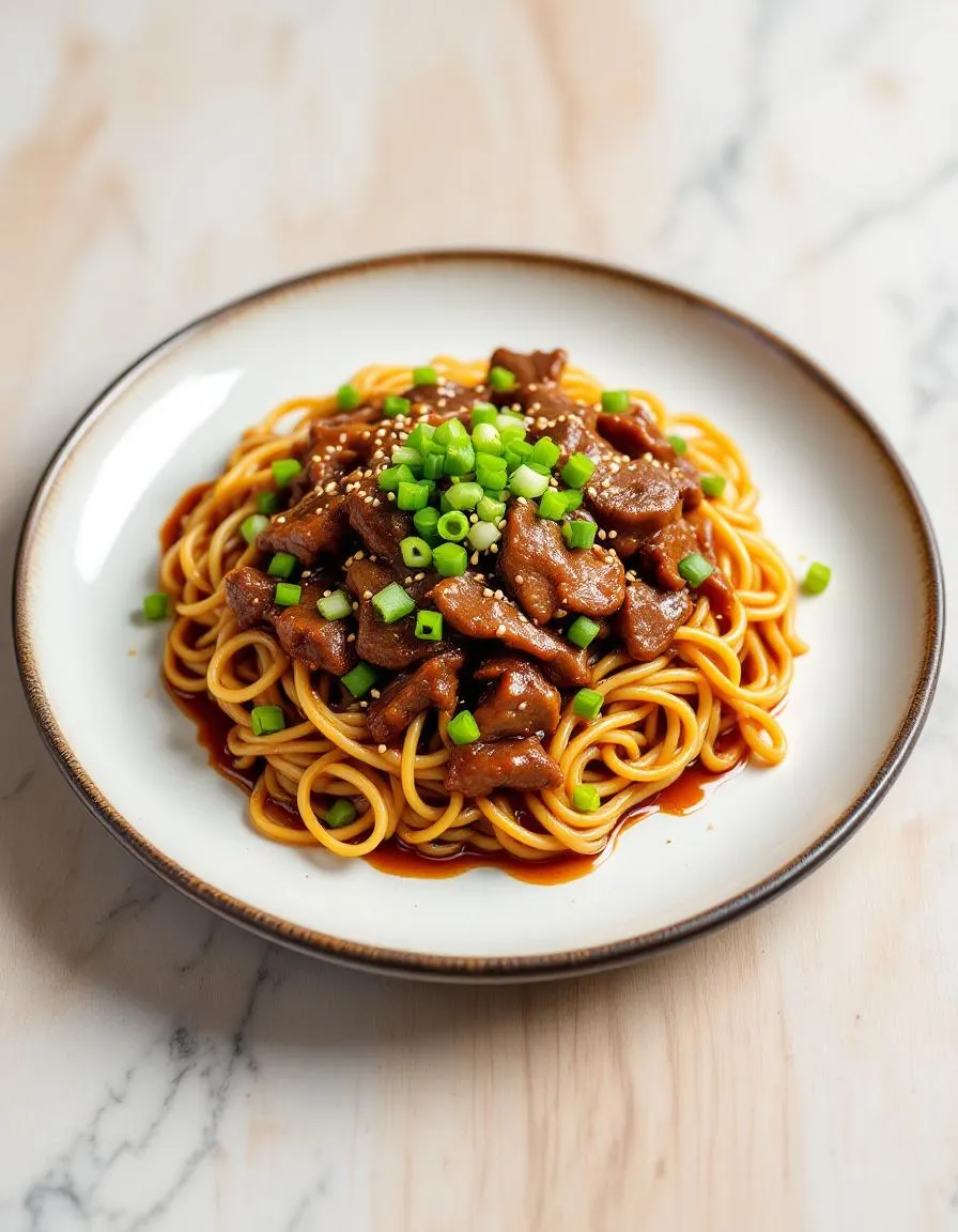 A delicious and savory dish featuring tender beef and noodles coated in a sticky, flavorful sauce.