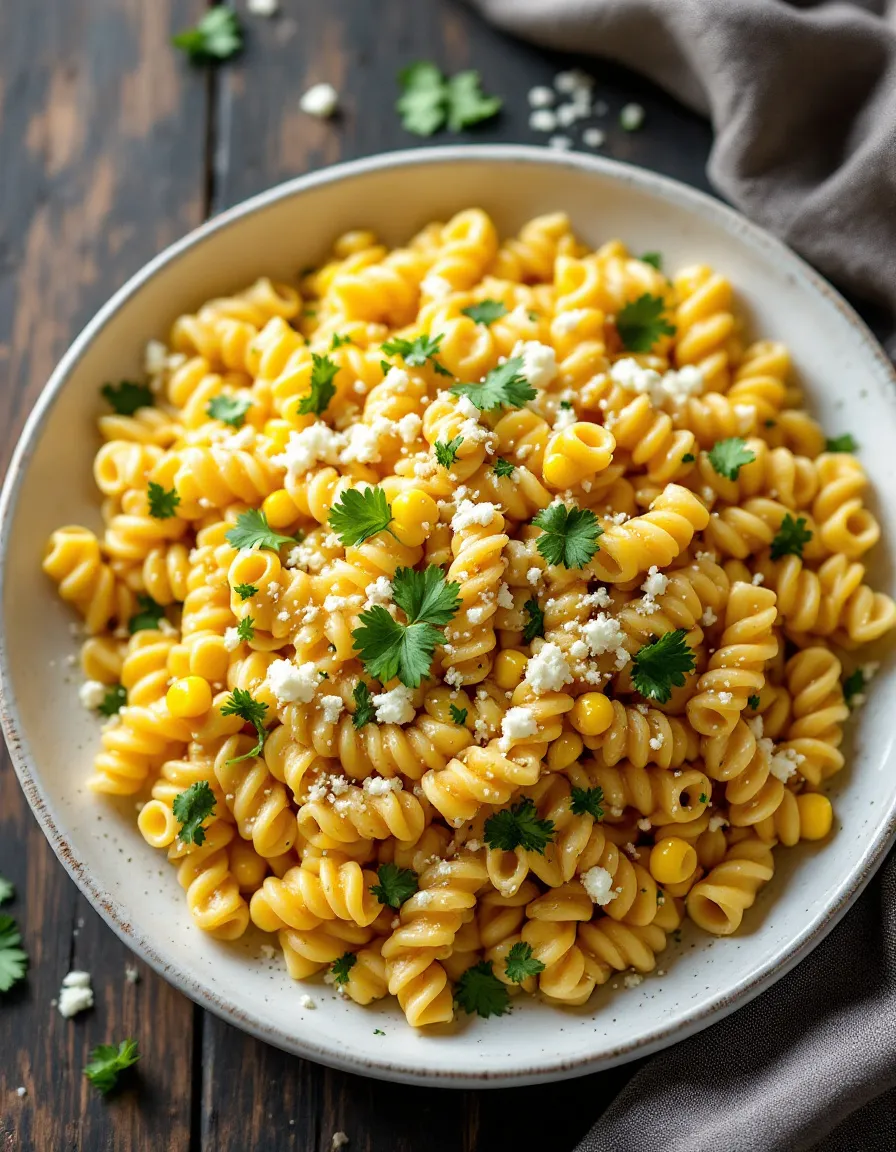 A vibrant fusion of Mexican street corn and pasta salad, featuring charred corn, creamy sauce, and zesty lime.