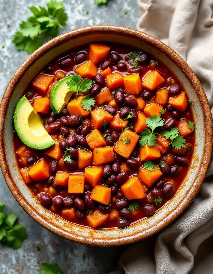 A hearty and flavorful vegetarian chili with sweet potatoes and black beans, perfect for a cozy meal.