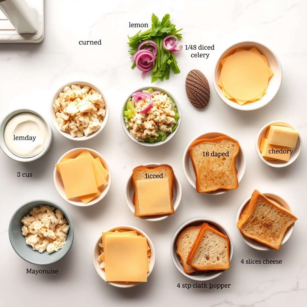 - Spread the tuna mixture evenly on 4 slices of bread. Top each with a slice of cheddar cheese and cover with the remaining bread slices.