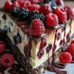 - Chill and Garnish: Refrigerate the cheesecake for at least 4 hours, or overnight. Garnish with fresh raspberries, blackberries, and chocolate shavings before serving.