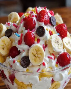 Satisfy your sweet tooth with this creamy Banana Split Fluff Delight! Quick, easy, and perfect for parties. 🍌🍦 #BananaSplit #Dessert #Fluff #EasyRecipes #PartyFood