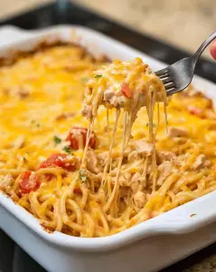 Indulge in the best Chicken Spaghetti recipe! Creamy, cheesy, and oh-so delicious. Perfect for family dinners or potlucks. #chickenspaghetti #cheesy #familydinner