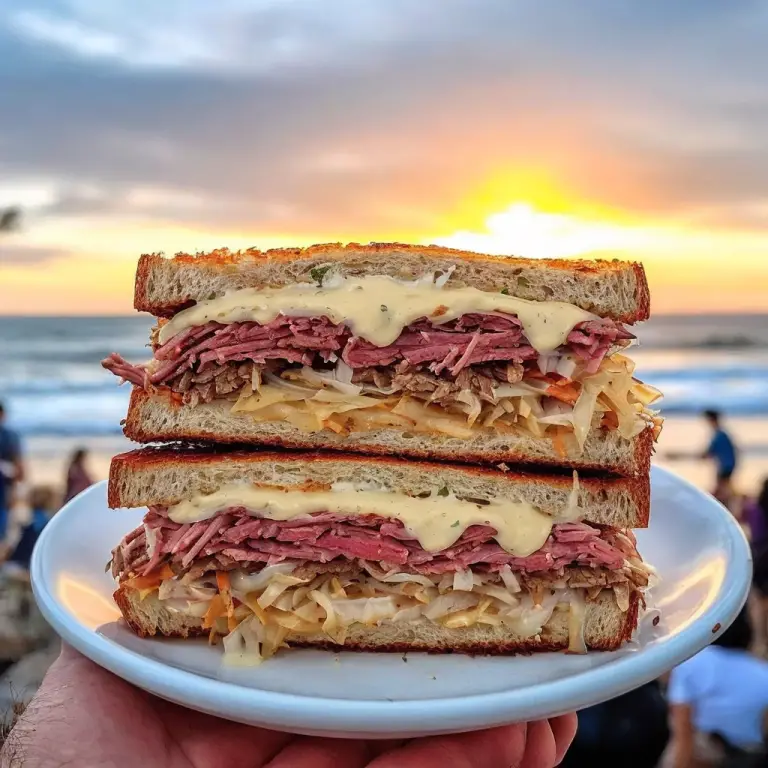 “Sink your teeth into this hearty Beef Reuben Sandwich – a classic favorite with tender beef, tangy sauerkraut, melty Swiss cheese, and zesty Russian dressing! #sandwich #Reuben #recipe #beef #lunch”