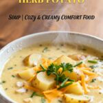 A cozy and creamy soup featuring potatoes, cheddar cheese, garlic, and fresh herbs for ultimate comfort.