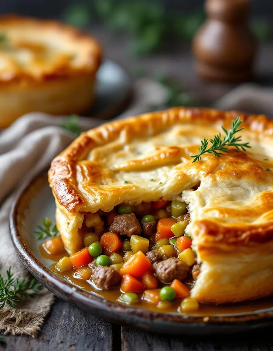 A comforting and hearty beef pot pie with tender chunks of beef, vegetables, and a rich gravy, all encased in a flaky pastry crust.