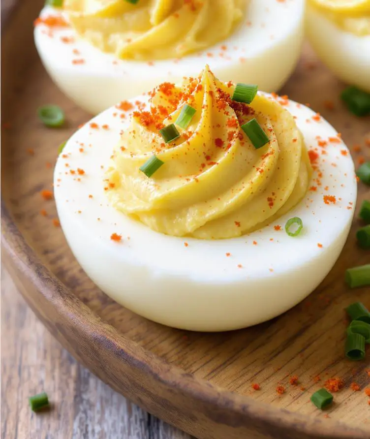 A timeless appetizer featuring hard-boiled eggs mixed with mayonnaise, mustard, and seasonings for a creamy filling.