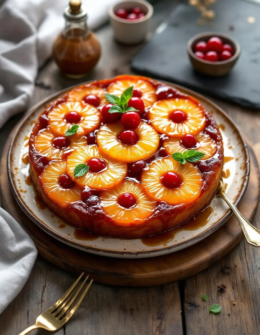 A classic dessert featuring caramelized pineapple and cherries atop a moist vanilla cake.