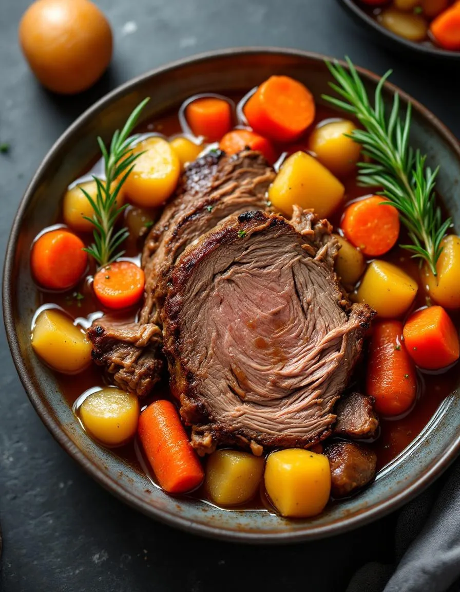 A tender and flavorful pot roast with vegetables, slow-cooked to perfection in a rich broth.
