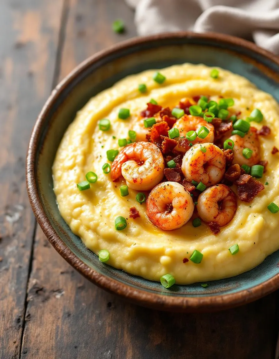 A classic Southern dish featuring creamy grits topped with savory shrimp cooked in a rich, flavorful sauce.